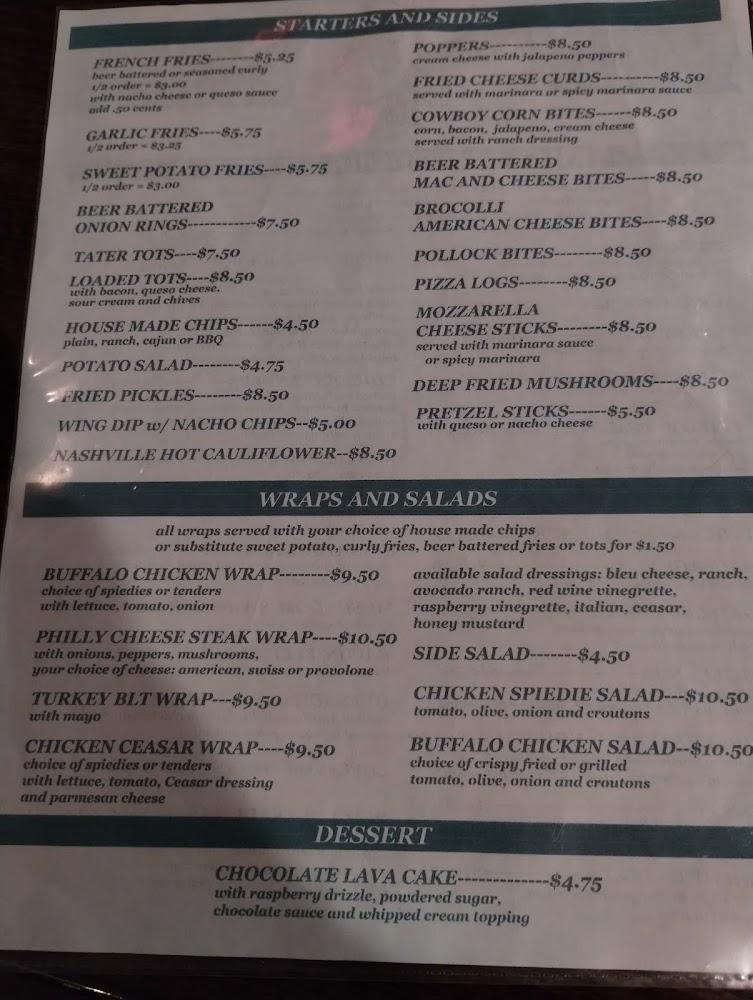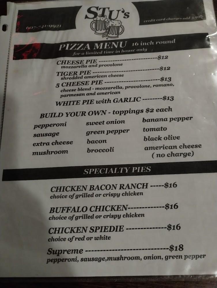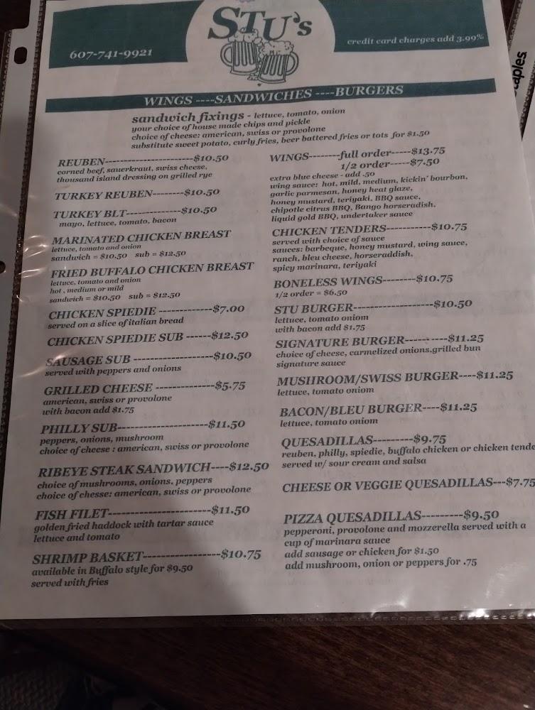 Stu's Place features a broad menu with 76 different items, ranging from appetizers to desserts. Highlights include French fries, garlic fries, and Buffalo chicken wraps.